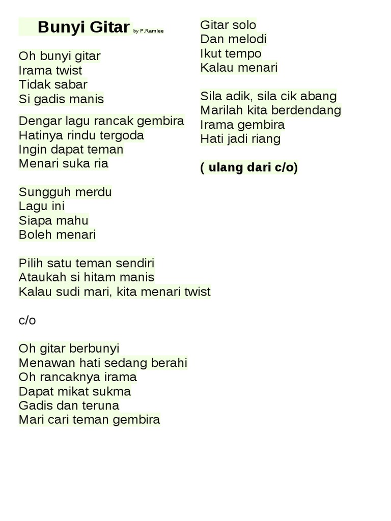 Guitar Pro P Ramlee. Bunyi Gitar Oh bunyi gitar Irama twist Tidak sabar Si gadis manis Dengar lagu rancak gembira Hatinya rindu tergoda Ingin dapat teman Menari suka ria Sungguh merdu Lagu ini Siapa mahu Boleh menari Pilih satu teman sendiri Ataukah si hitam manis Kalau sudi mari kita menari twist 1 Oh gitar berbunyi Menawan hati sedang berahi Oh rancaknya irama. Ya allah ya rahman ya rahim ya malik.